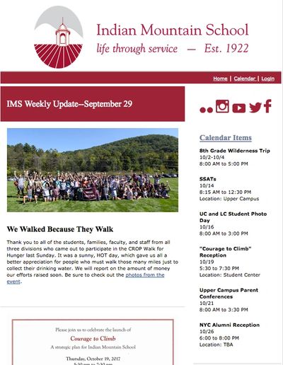 Conceived, built, and produced a weekly email newsletter distributed to parents, faculty, and staff at Indian Mountain School to keep them informed of upcoming events and highlights from past news.